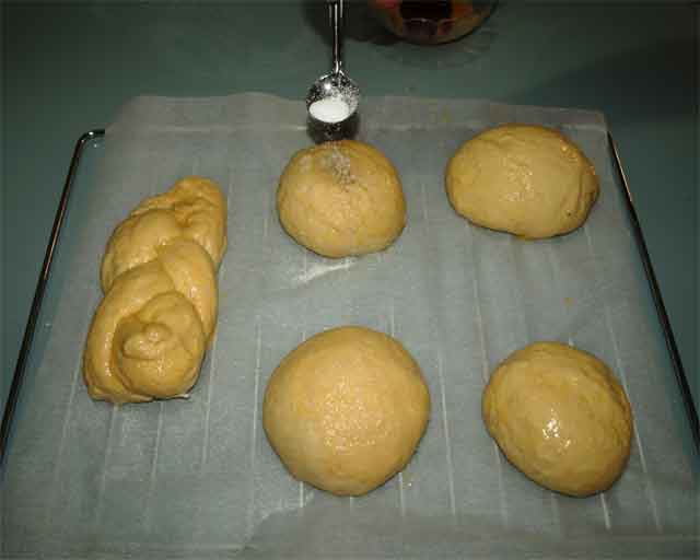 7. Vuelve a darle forma, pinta con el huevo y espolvoréalo con azúcar.